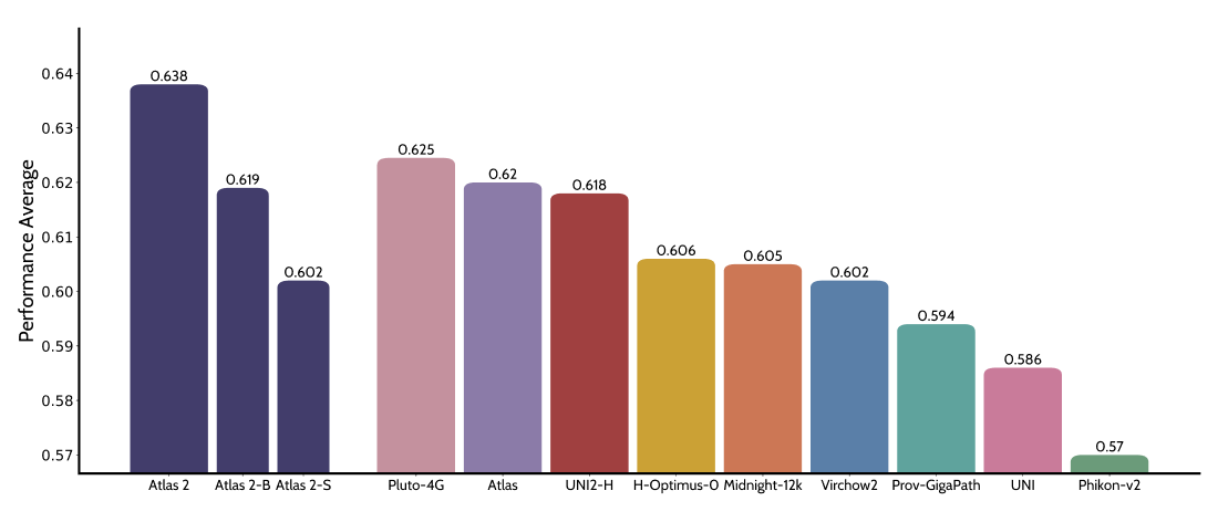 On average, when evaluated across a total of 80 benchmarks, Atlas 2 outperformed all other public foundation models. Specifically, Atlas 2 led on all benchmark suites: HEST, which measures performance on molecular tasks; EVA, which focuses on morphological tasks; and PathoROB and Plismbench, which assess the robustness of foundation models. This high performance stems from a combination of the extensive, high-quality data set, careful data curation, and our unique algorithmic innovations.